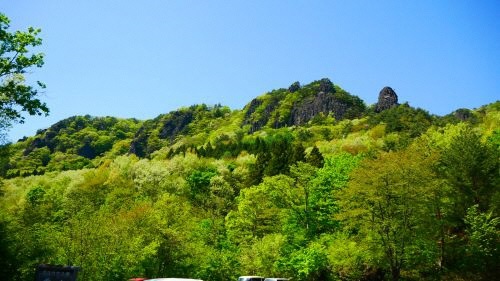 阿武隈山系のゆるやかな稜線の中にそそり立つゴリラのような岩が、ひときわ威容を誇り、春の新緑、山ツツジの花開く5月下旬、そして10月中旬~11月初旬の紅葉は目を見張る美しさとなります。特に紅葉のころ、岩肌に赤や黄色の色彩がちりばめられたさまは、目を見張る美しさとなります。