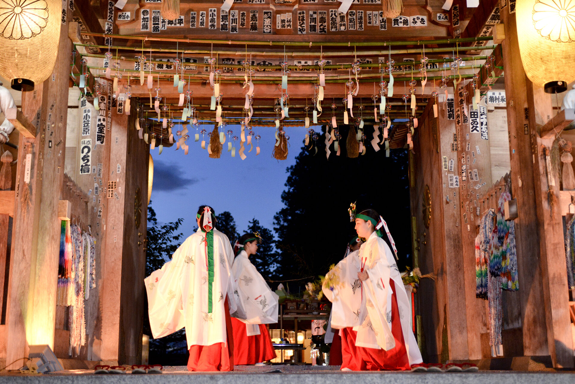 内苑や表参道に設置された風鈴廊に約3,500個の風鈴が飾られ、夕刻からは七色にライトアップされて非日常的な空間となります。また、いたるところに設置された笹竹には、参拝者が思い思いに書き記した色とりどりの短冊で彩られ、境内では、地元の伝統工芸や作家さんが作製した風鈴の授与(販売)もされます。8月7日に行われる乞巧奠では、装束を着けた歌人らによる和歌披講をはじめ、地元の高校生や小学生たちが舞う巫女舞や太々神楽などが奉納されます。