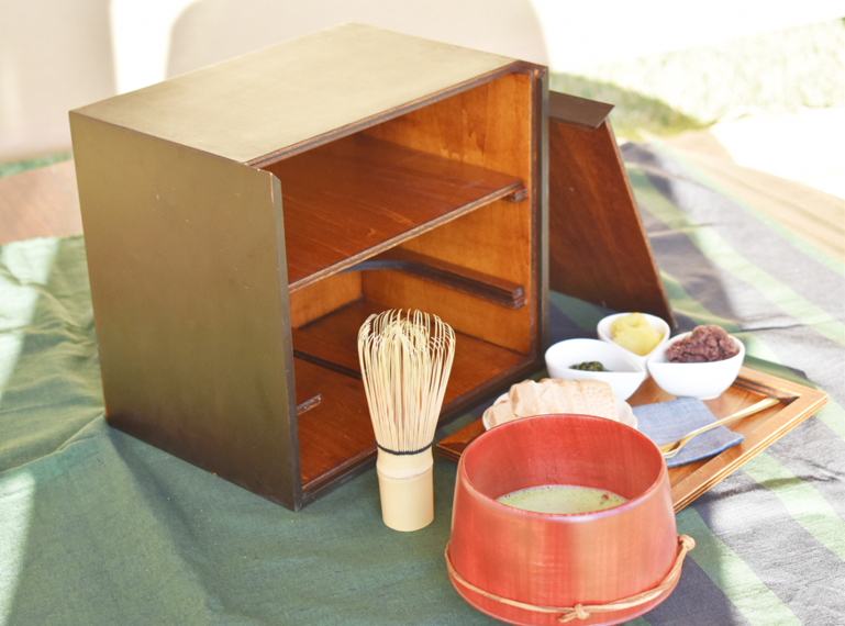千家茶道再興の地である鶴ヶ城公園内に「野外茶室」を設置し、敷居が高い「お茶」のイメージを払拭し、誰でも気軽に自分のペースで自由な野点を体験できるコンテンツです。茶道は、流儀や作法があり、身近に捉えられていないという側面もあり利用者が限定されたことから、気軽に利用できるような雰囲気にします。