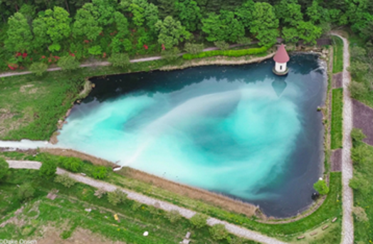 また、鏡ケ池公園の隣にある緑が池に、湯花をたっぷり含んだお湯が流れると、幻想的な空間に導かれ、自然の美術館にいるようになるほど神秘的な模様が描かれます。