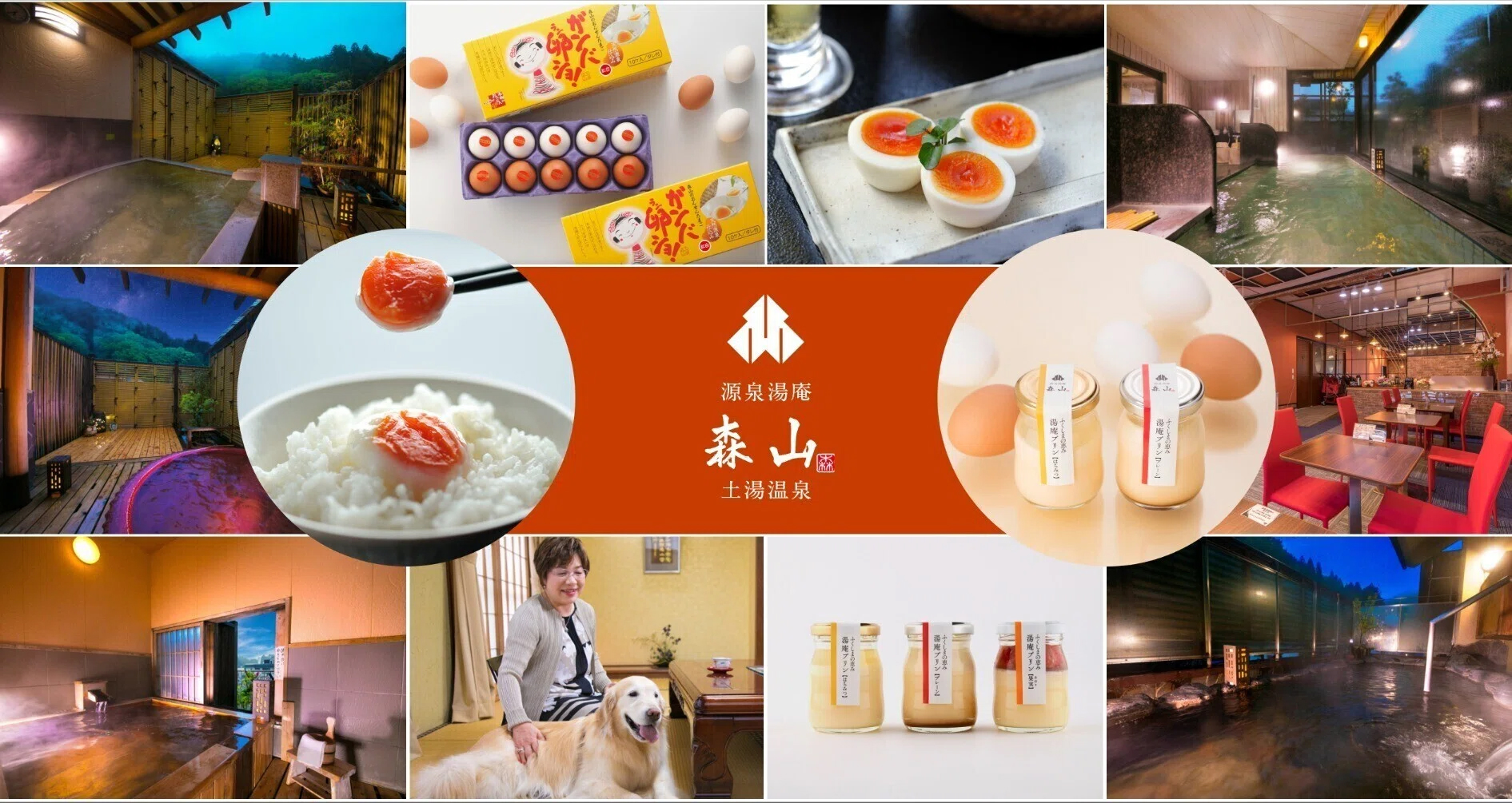 自家源泉で仕込む「温泉たまご」は土湯温泉名物。併設カフェ「源泉湯庵森山」では、福島ブランド「ふくしまスイーツプレミアム」認証の福島のご当地プリン「湯庵プリン」を販売。2024年ふくしまプレDCには、JR東日本福島駅と共同開発した「JR福島駅新幹線連結湯庵プリン」も登場し、新しい福島土産として大人気です。