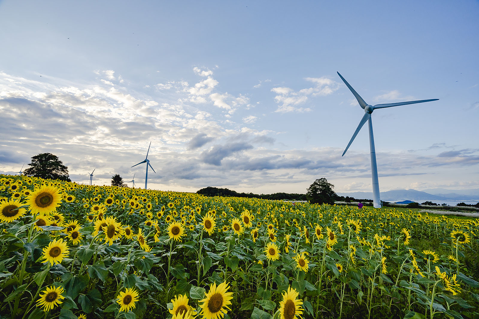 猪苗代湖の南に位置する標高約1000mの布引風の高原の頂上からは、猪苗代湖と磐梯山を一望できる最高のロケーションが楽しめます。日本最大級の風力発電があり、33基の巨大風車の下、夏のヒマワリ、秋のコスモ…