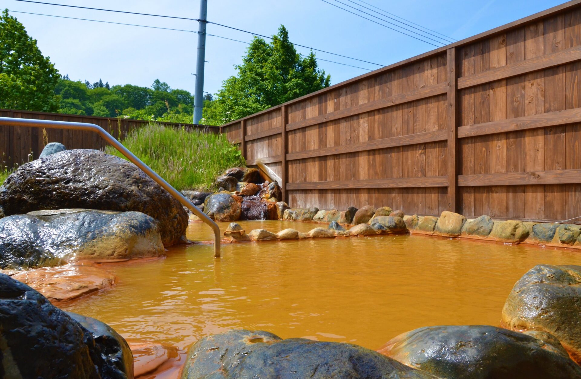 鮎釣りの聖地として知られる伊南川沿いに湧く温泉です。一瞬目を疑う程の濁りが特徴で、泉質はナトリウム塩化物泉です。温泉成分中の鉄分含有量が豊富で、酸化した鉄成分が湯を、そして岩をも赤く染めています。全浴…