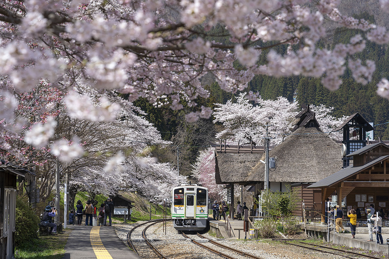 会津鉄道会津線には、日本でも珍しい萱葺き屋根の駅舎「湯野上温泉駅」があります。東北の駅百選に選ばれており、そのホームに並ぶソメイヨシノが列車を出迎えます。待合室には囲炉裏で火が焚かれ、駅舎の脇には足湯…