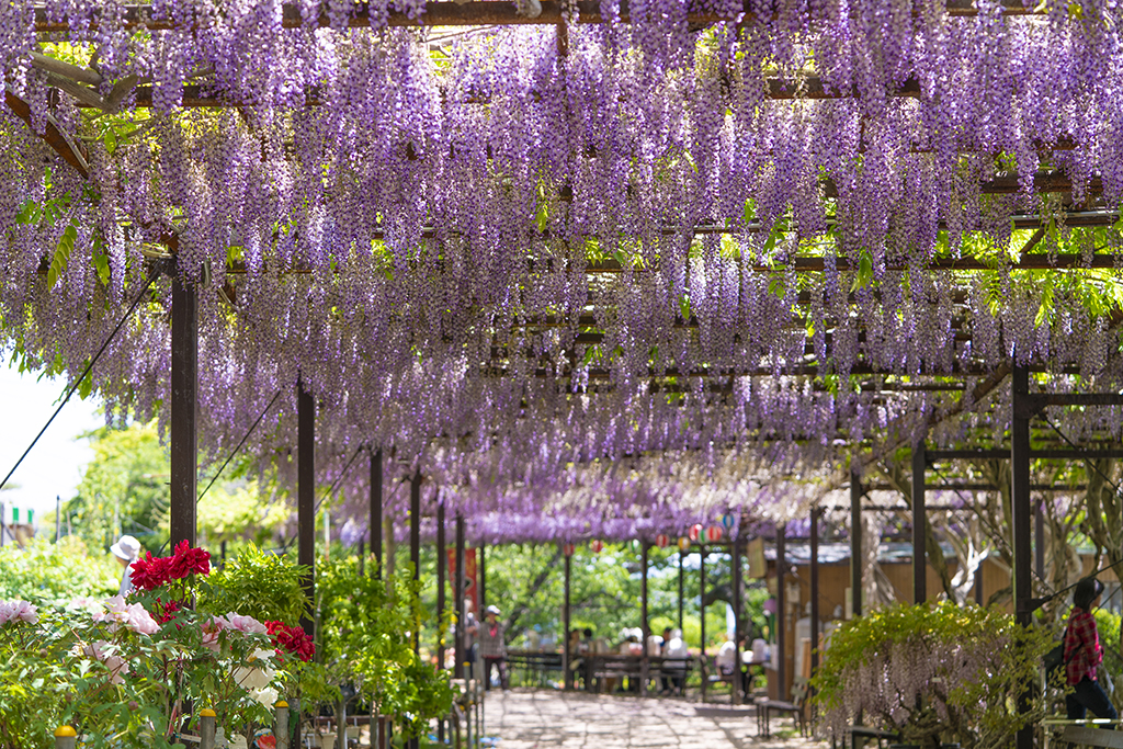梅や桜だけでなくハナモモ、レンギョウ、モクレンなどが一斉に咲き誇る花の名所です。その美しさは写真家の故秋山庄太郎氏に「桃源郷」とまで言わしめるほど。春になると約70種類の花が次々と咲き競い、周辺の花…
