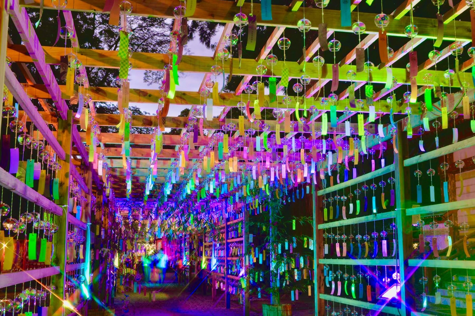 内苑や表参道に設置された風鈴廊に約3,500個の風鈴が飾られ、夕刻からは七色にライトアップされて非日常的な空間となります。また、いたるところに設置された笹竹には、参拝者が思い思いに書き記した色とりどり…